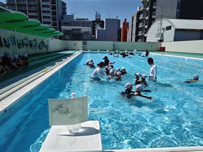 1年生では,水遊びの楽しさに触れ,水の中の移動,潜る,浮くなどの基本的な動きを身に着けられるようにしています。