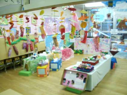 昨年まで同じように学んでいた1年生も、小学生の目で客観的に幼稚園児の作品を鑑賞すると製作の苦労の過程がよくわかるのか、「うわ−、すごいな!」と、園児の力作に感心していました。