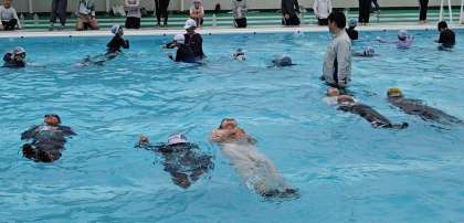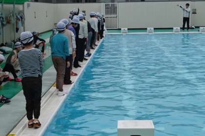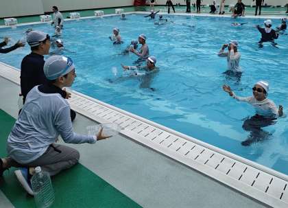 いざというときに呼吸を確保し,救助されるまで浮き続けられるように,ペットボトルを使って背浮きの練習をしました。
