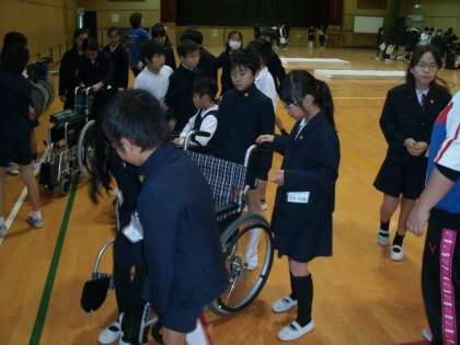 4年生の総合的な学習の時間(フロンティア)では、福祉学習の一環として毎年車いす体験をしています。