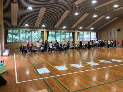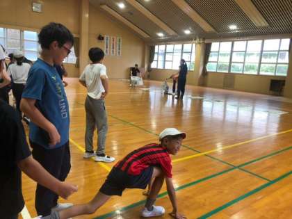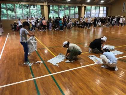 コースター作りの次は体育館で体と頭とチームワークが問われる活動をしています。