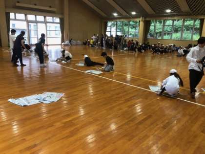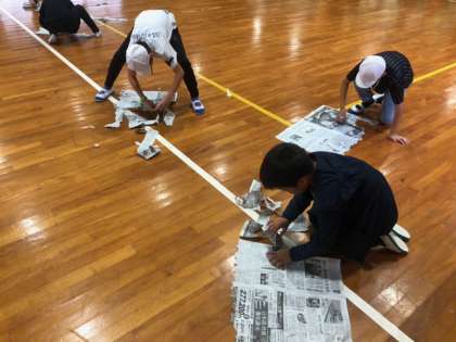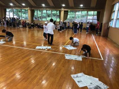 新聞紙をチーム対抗で細く長く繋がるようにちぎっていくゲームです。