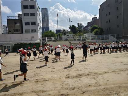 地震が発生したという想定で運動場に避難した後、津波警報が発令された想定で校舎の3・4階に避難しました。