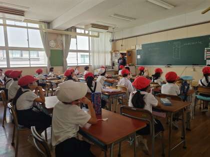 最後に教室で校長先生のお話を聞きました。みんな「お・は・し・も」に気をつけて避難することができました。
