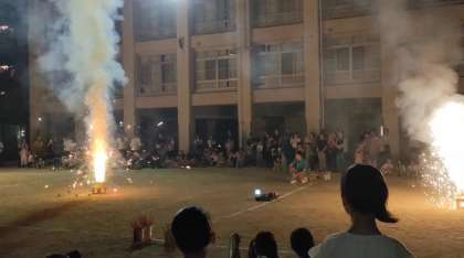 花火の注意説明を聞いた後、受付で渡された手持ち花火1本1本に火をつけていき、校庭は花火の光と煙で満ちあふれていきました。