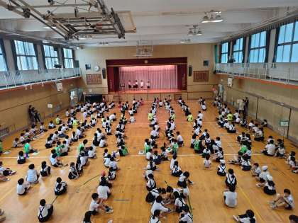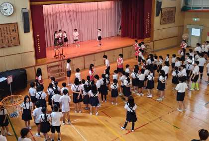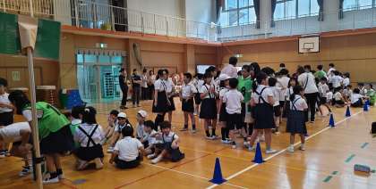 今日は、赤・黄・緑のチームが講堂に集まってゲームをしました。