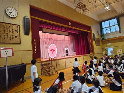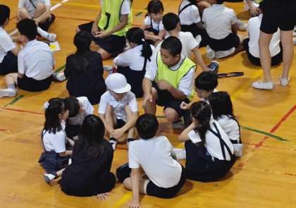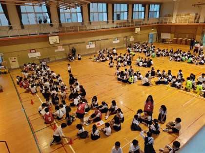 今日は赤・黄・緑の班が講堂に集まり,「私は誰でしょう」ゲームをしました。