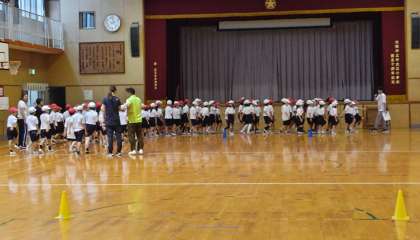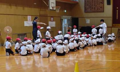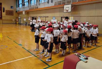 あいにくの雨で運動場が使えないので、講堂でかけっこの練習をしました。