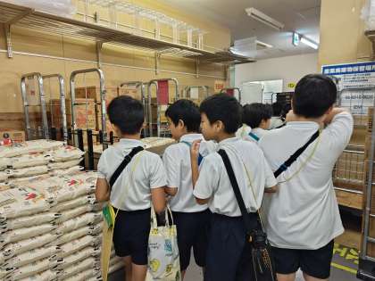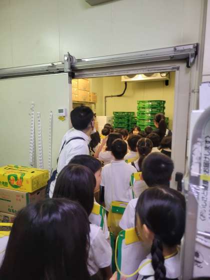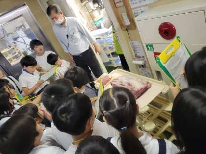 お店の方に案内していただき,普段見られないバックヤードの様子も見学することができました。冷凍庫の見学では,「寒い。」「凍りそう。」と言う声があがりました。