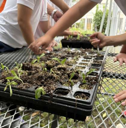 先月の委員会活動の時間にまいた種が発芽し,大きくなったので,ひとまわり大きいポットに植え替えることになりました。