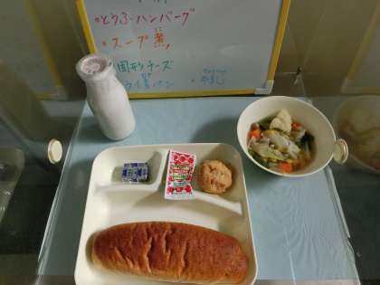 朝から寒い日には子どもたちにとって美味しくて温かい給食の時間が待ち遠しいです。今日の献立は、とうふハンバーグ・野菜のスープ煮・固形チーズでした。