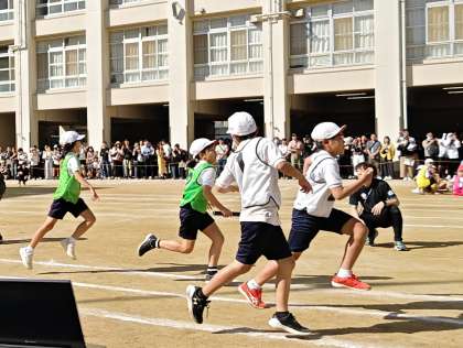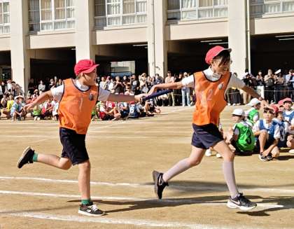 4年生のリレーでは,一人半周ずつ走ってバトンをつなぎました。