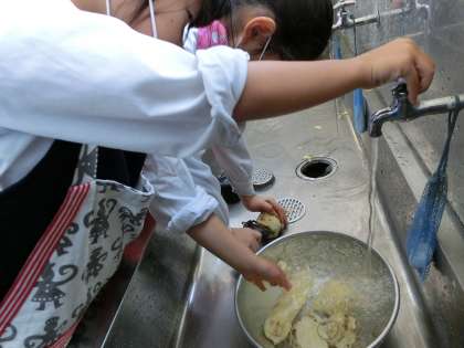 子どもたちは前日にピーラーで皮をむいた後、それを蒸して小麦粉と混ぜて団子状にしておきました。それをホットプレートで焼きました。ホットケーキのような甘さと懐かしいサツマイモの香りで美味しくいただきました。