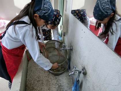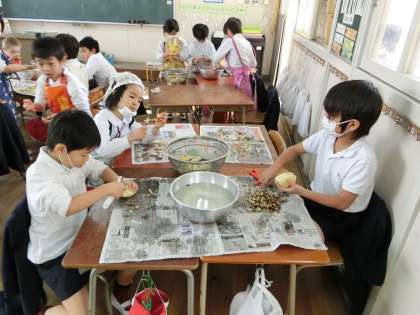 2年生はさつまいもが大豊作でたくさん収穫ができたことはすでにお伝えした通りですが、今日はいよいよお楽しみの調理を家庭科室で行いました。