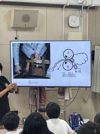 来週大阪歴史博物館で行う「綿繰り体験」のための学習をしました。本番までに,綿と大阪との関係や歴史的背景などの学習を3時間します。今日は2つのクラスで第1時を行いました。しっかり学んで,「綿繰り体験」を充実させたいと思います。