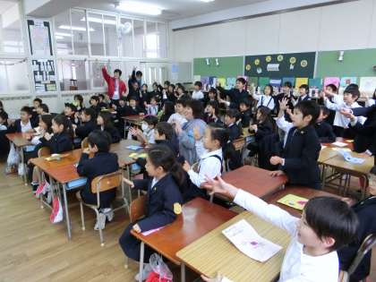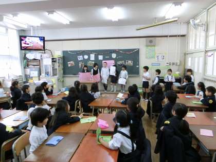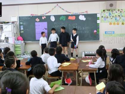 5時間目。2年生の1組・2組の教室に1年生を招いておいもパーティーが行われました。1年生を前にして2年生は大張り切り。サツマイモの栽培や収穫の様子を寸劇やジャンケンゲームや漫才などで紹介していました。最後に1年生の子どもたちは、2年生が焼いたサツマイモクッキーをお土産にもらって大喜びでした。