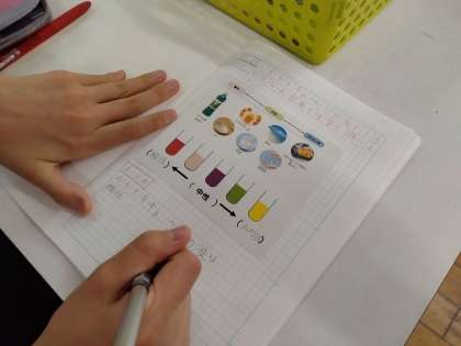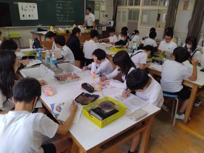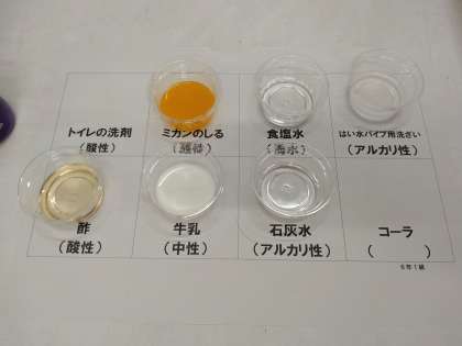 紫キャベツの性質を利用して、水溶液の実験をしました。