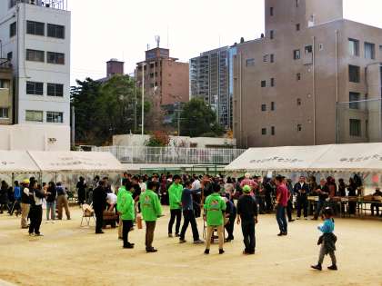 師走とは思えない小春日和の陽気の朝。運動場では恒例の地域もちつき大会が開催されました。地域の方々により早朝からテントを張られ、薪窯コンロで蒸されたもち米が湯気をあげながら次々と石臼にひっくり返されると、続々と訪れる子どもたちや家族の方も加わってにぎやかにもちつきが始まりました。