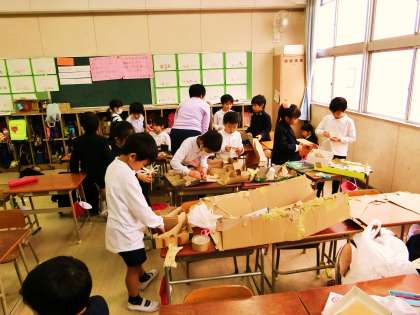 1年生の教室では、生活科で集めたどんぐりを使って、次の幼稚園との交流活動のためにグループで考えたゲームや遊びの準備に夢中に取り組んでいました。