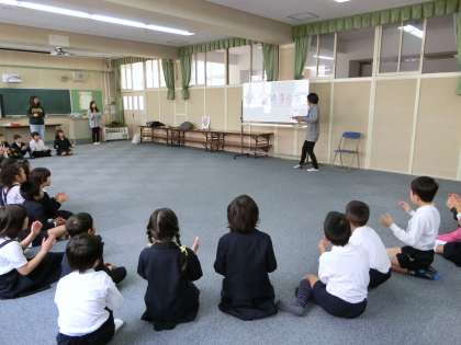 2・3時間目。多目的室では2年生が大阪外語専門学校の天野先生や学生の皆さんと、数字や物の名前の英語活動に楽しく取り組んでいました。天野先生から、「2年生がとてもしっかりしてきたのには驚きました」と褒めていただきました。
