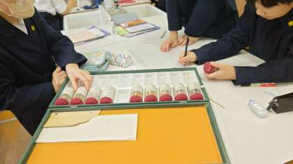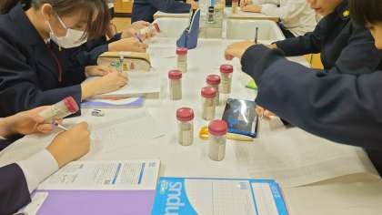 「地層がしま模様に見えるのは,どうしてだろう。」という問題を解決するために,校舎建築の時のボーリング試料を使って地層のようすを観察しました。