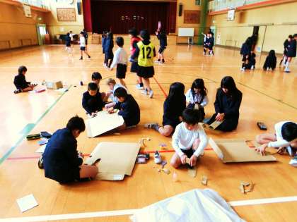 5時間目。明日のにこにこまつりの成功に向けて、各教室では高学年が中心となって、店の準備や飾りつけに時間ぎりぎりまで協力して取り組んでいました。