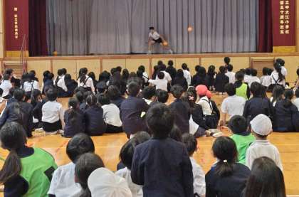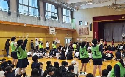 講堂には,赤・黄・緑の30班が集まり,ボールの数数えゲームをしました。