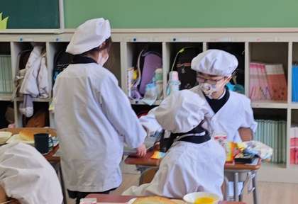 4月の入学当初は,6年生のお兄さん・お姉さんに配膳を手伝ってもらっていましたが,今では自分たちでできるようになりました。