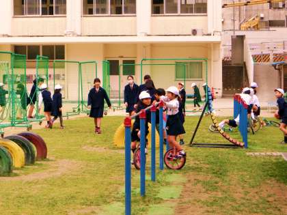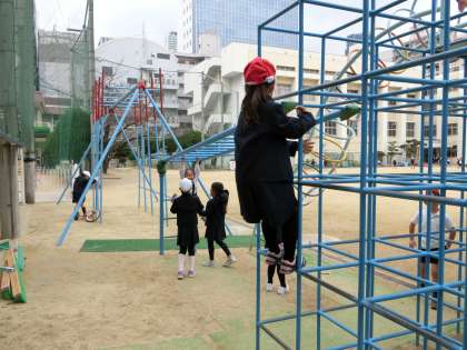 昨日よりも朝の冷え込みが厳しい運動場。休み時間には、友達と励まし合って鉄棒で一輪車を練習したり、遊具では足の届かない1年生を上級生が支えたりするほほえましい姿が見られました。