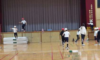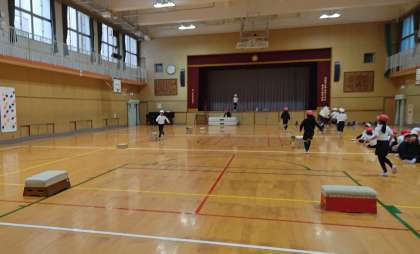2年生では,段ボール箱を跳び越えるサーキット遊びをしました。