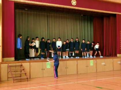 6時間目は委員会活動の時間。講堂では、給食委員会の子どもたちが給食週間に行われる給食集会のリハーサル練習に真剣に取り組んでいました。