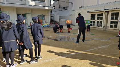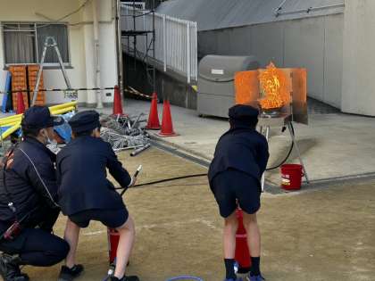 6年生は,燃えている火に水を当てて消火する訓練をしました。