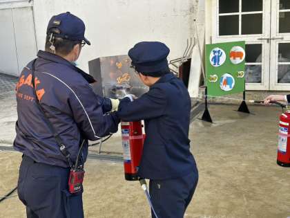 5・6年生の「火災・避難訓練」の2つめは,水消火器を使った「消火訓練」です。