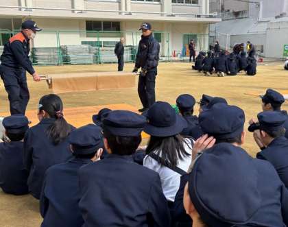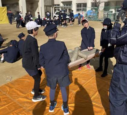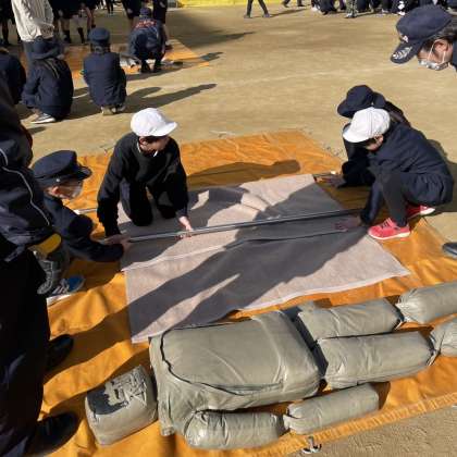 2本の丈夫な棒と毛布を使って担架を作り,人形をけが人に見立てて運ぶ訓練をしました。