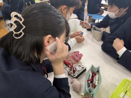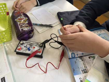 (写真は,発光ダイオードや電子オルゴールについて調べているところです。)
