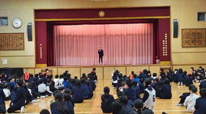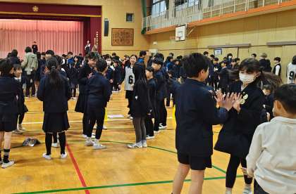 今朝の色別集会は,橙・青・白のチームが講堂に集まって行いました。