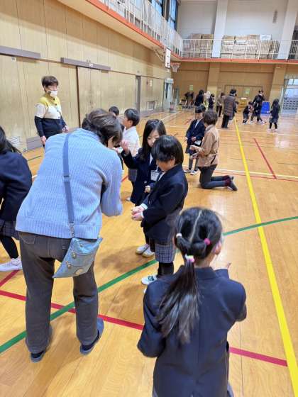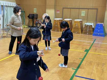 たくさんの地域の方に来ていただいて,こま回し,メンコ,けん玉,お手玉のやり方を教えていただきました。