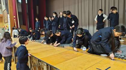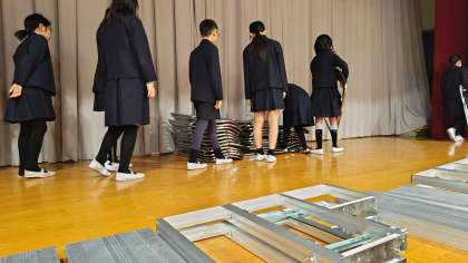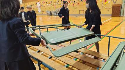みんなで協力し,長いすやパイプいすを出して並べたり,張り出し舞台やひな壇を設置したりしました。5年生の皆さんのおかげで,講堂が卒業式の会場らしくなりました。