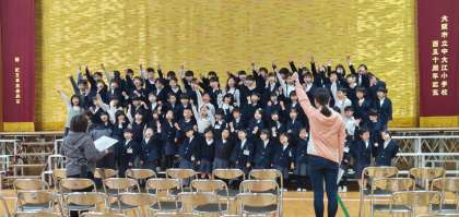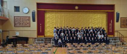 卒業式の練習のために用意された講堂のひな壇に並んで,呼びかけをしたり「パワフルパワー」の歌を歌ったりしました。