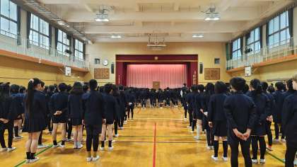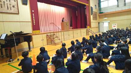 大阪市歌を斉唱した後,校長先生のお話と生活指導の先生のお話を聞き,最後に校歌を歌いました。