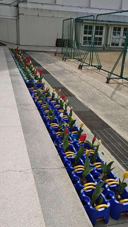 校庭では新2年生が昨年度植えたチューリップが咲いています。