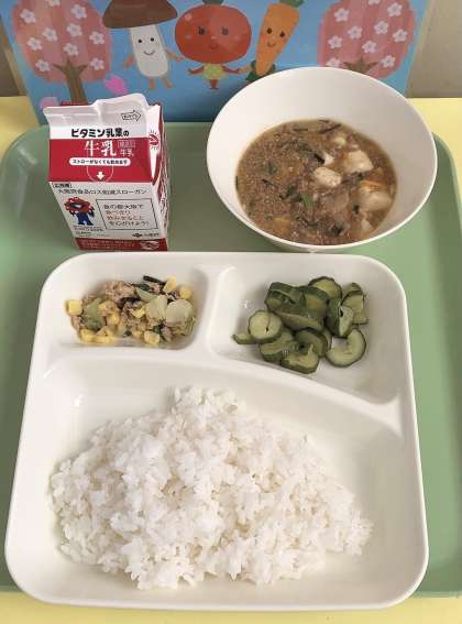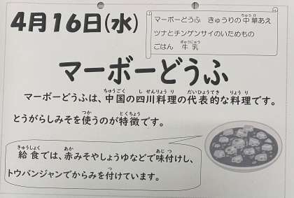 小学校なので、まったく辛くない「マーボー豆腐」です。