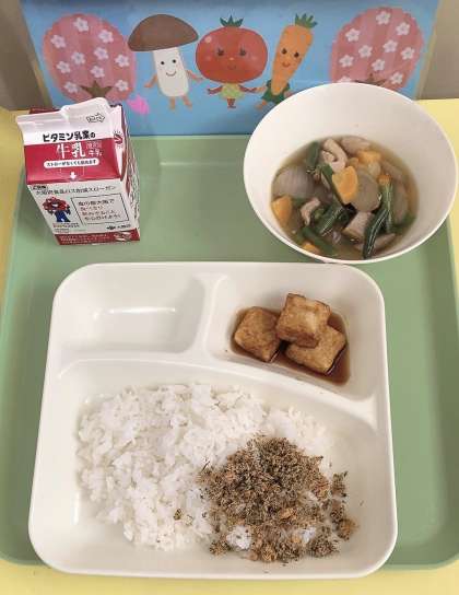 今日の給食は、煮物に、あつあげ、鮭そぼろと、和食のメニューでした。