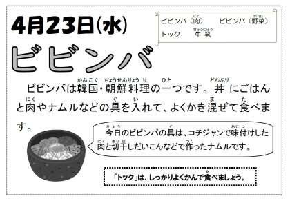 今日の給食は、ビビンバに、トックの入った汁もので、韓国朝鮮のメニューでした。