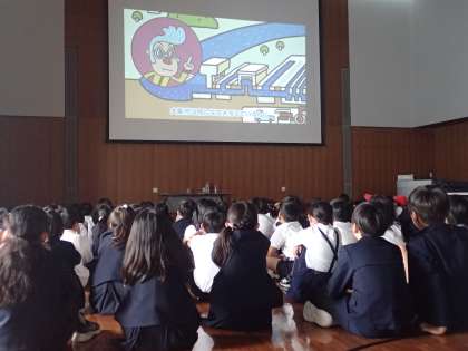 外での見学が終わったら、建物内でビデオによる学習と実験をしました。