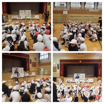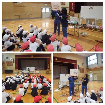 今日は講堂と運動場で「パッカー車」の学習がありました。