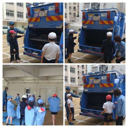 制服を着せてもらったり、パッカー車に乗せてもらったりしました。
