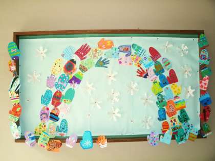 2月の玄関掲示は雪で遊ぶ子ども達をイメージしたかわいい手袋。一年で一番寒さが厳しい季節ですが、掲示板に貼られた雪の結晶やかわいい手袋を見ていると、寒い日もポカポカと心が温まってくるようです。