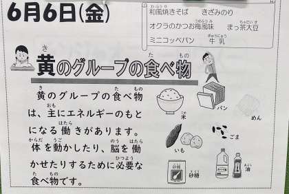 今日は、エネルギーのもととなる、黄のグループの食べ物が多く出ました。