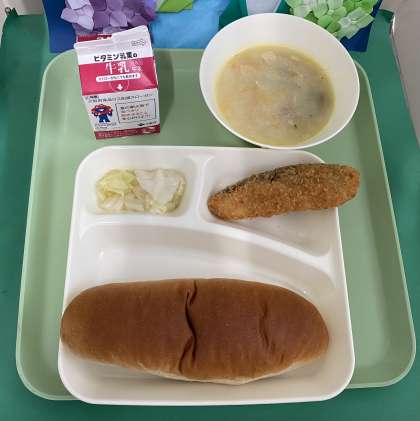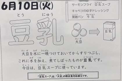 今日の給食は、豆乳をベースにした豆乳スープでした。